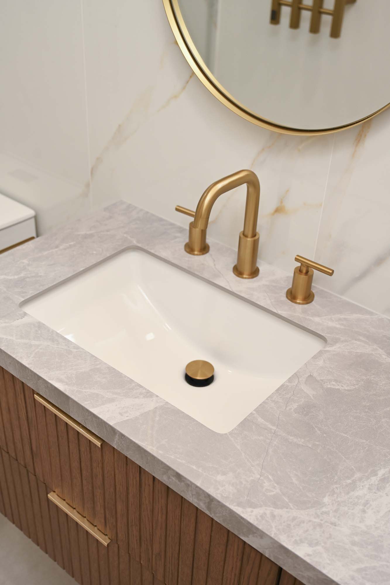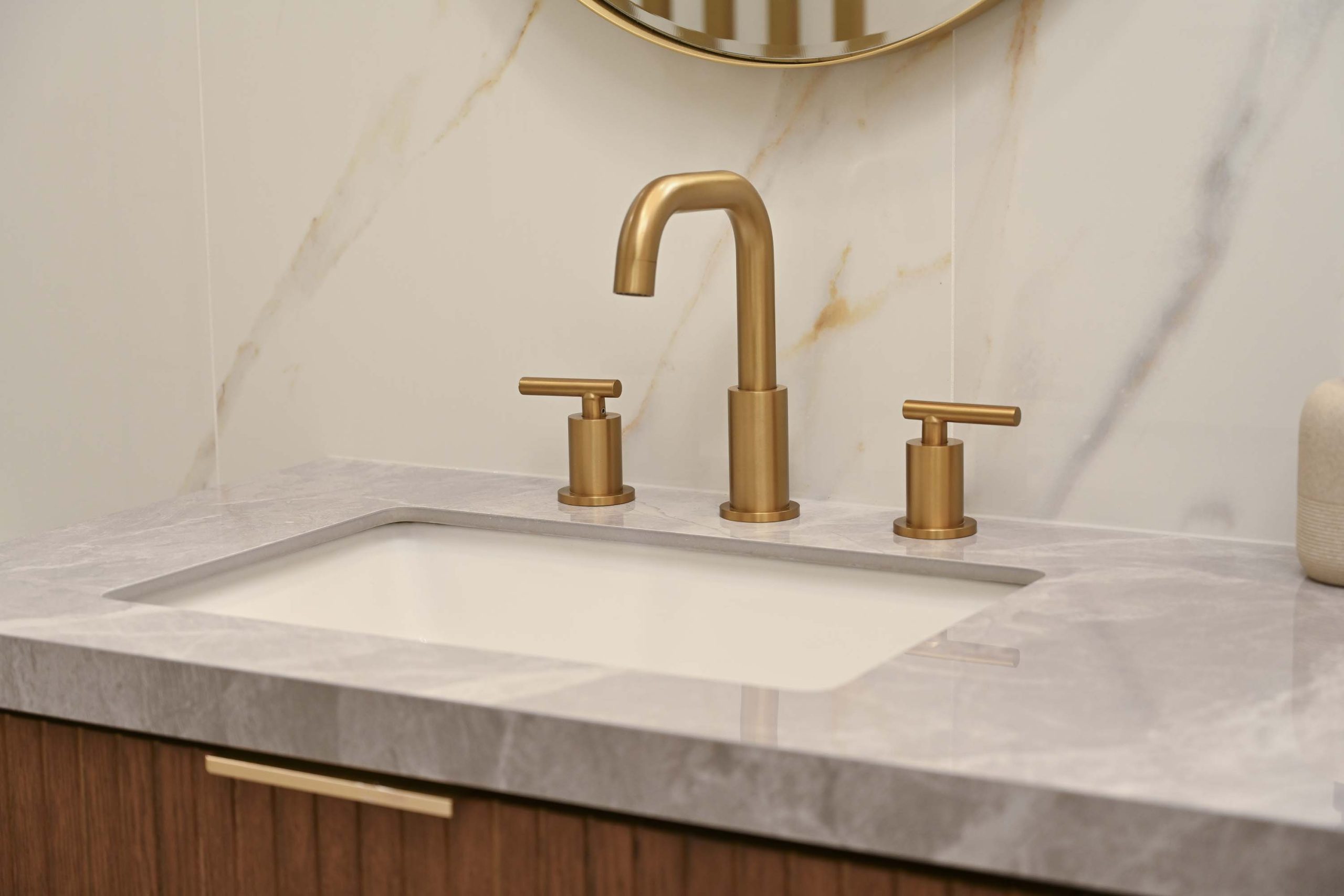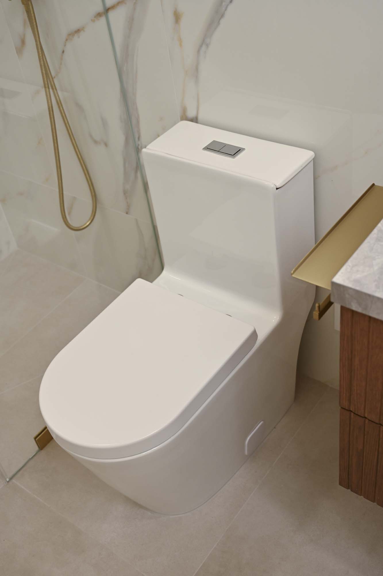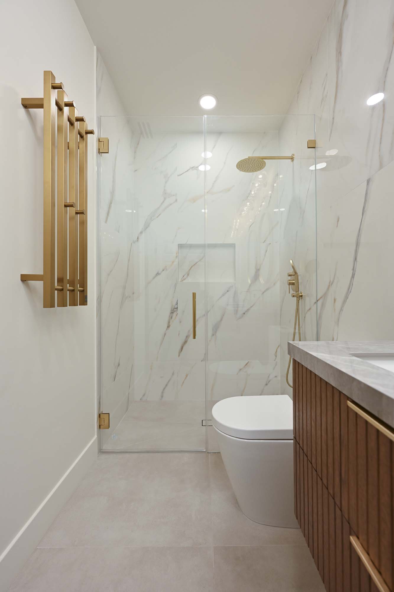 Fully remodeled secondary bathroom featuring large-format tile on walls and floors, a custom floating vanity with porcelain countertop, and coordinated gold fixtures for a clean, modern finish.