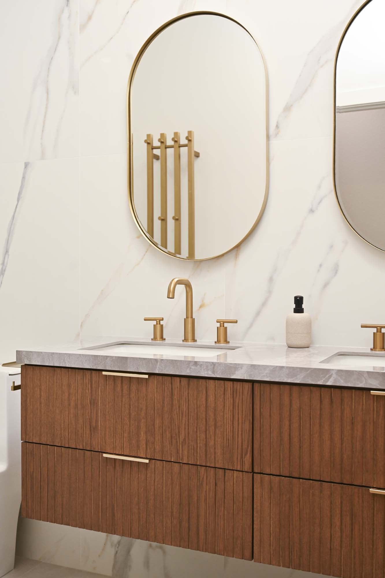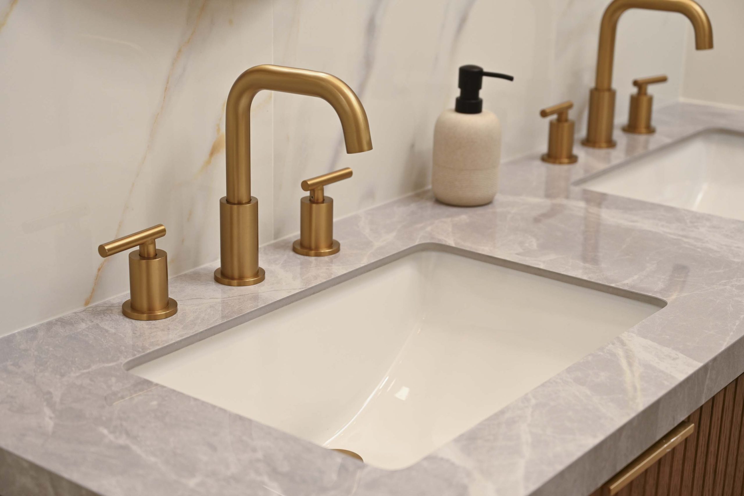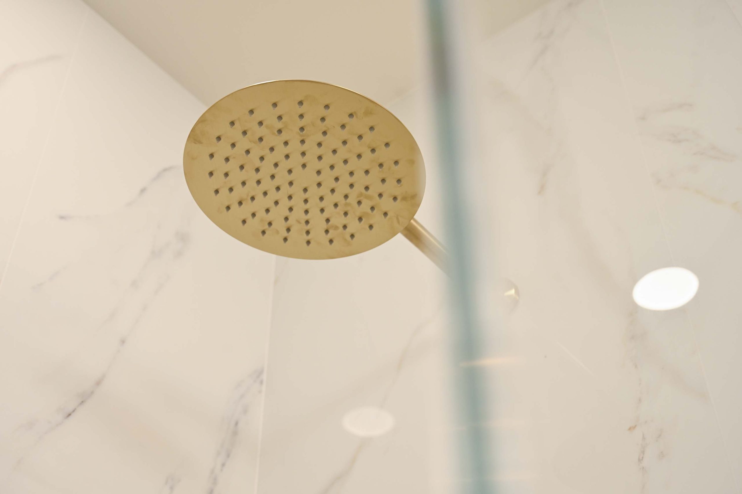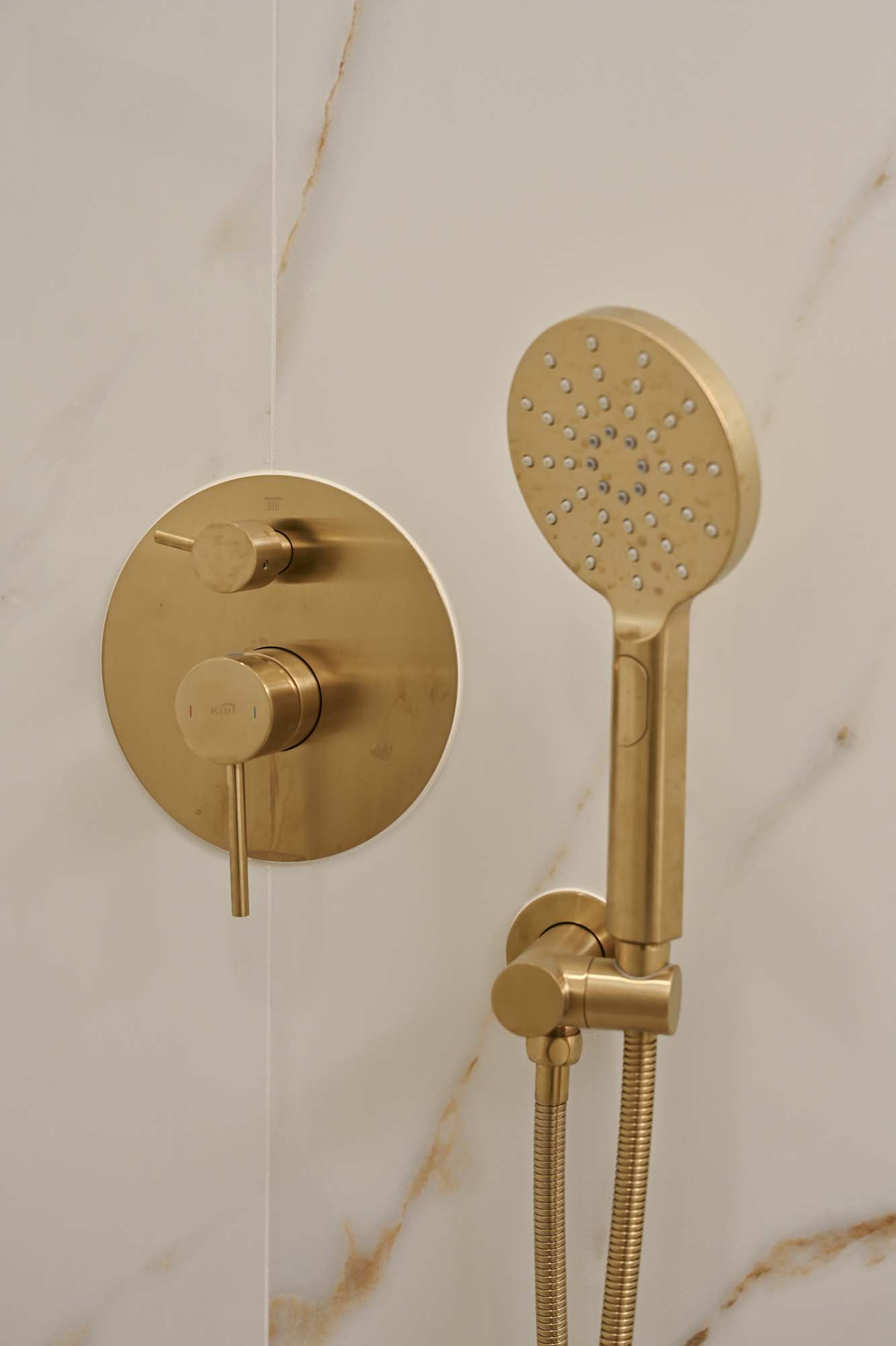 Fully remodeled secondary bathroom featuring large-format tile on walls and floors, a custom floating vanity with porcelain countertop, and coordinated gold fixtures for a clean, modern finish.