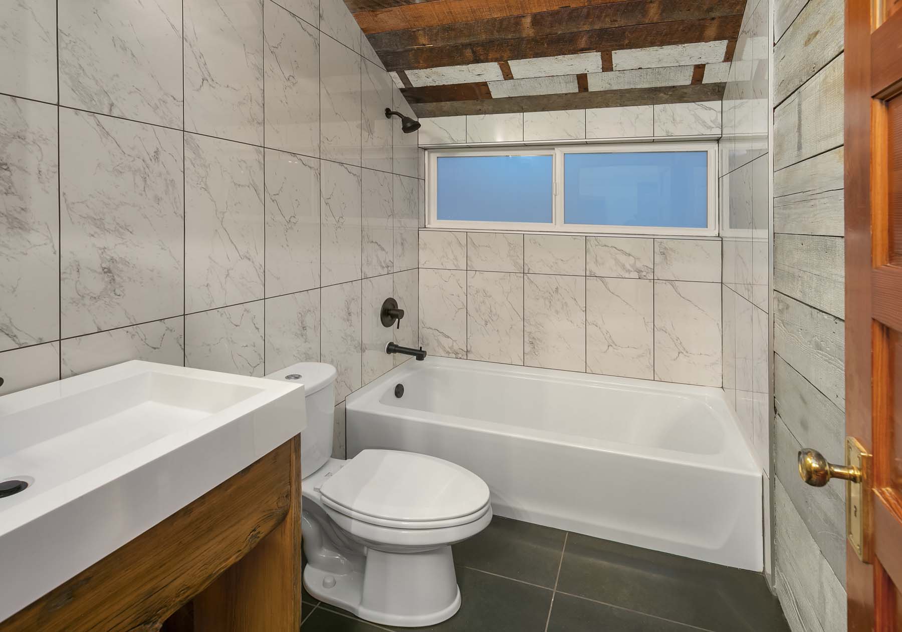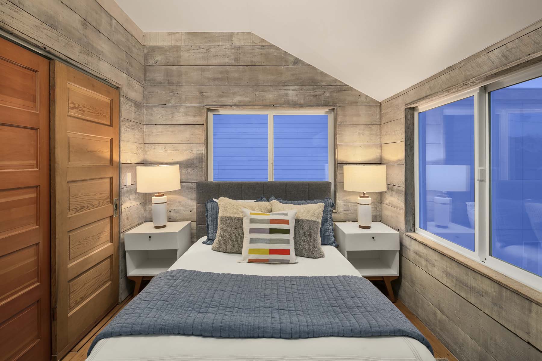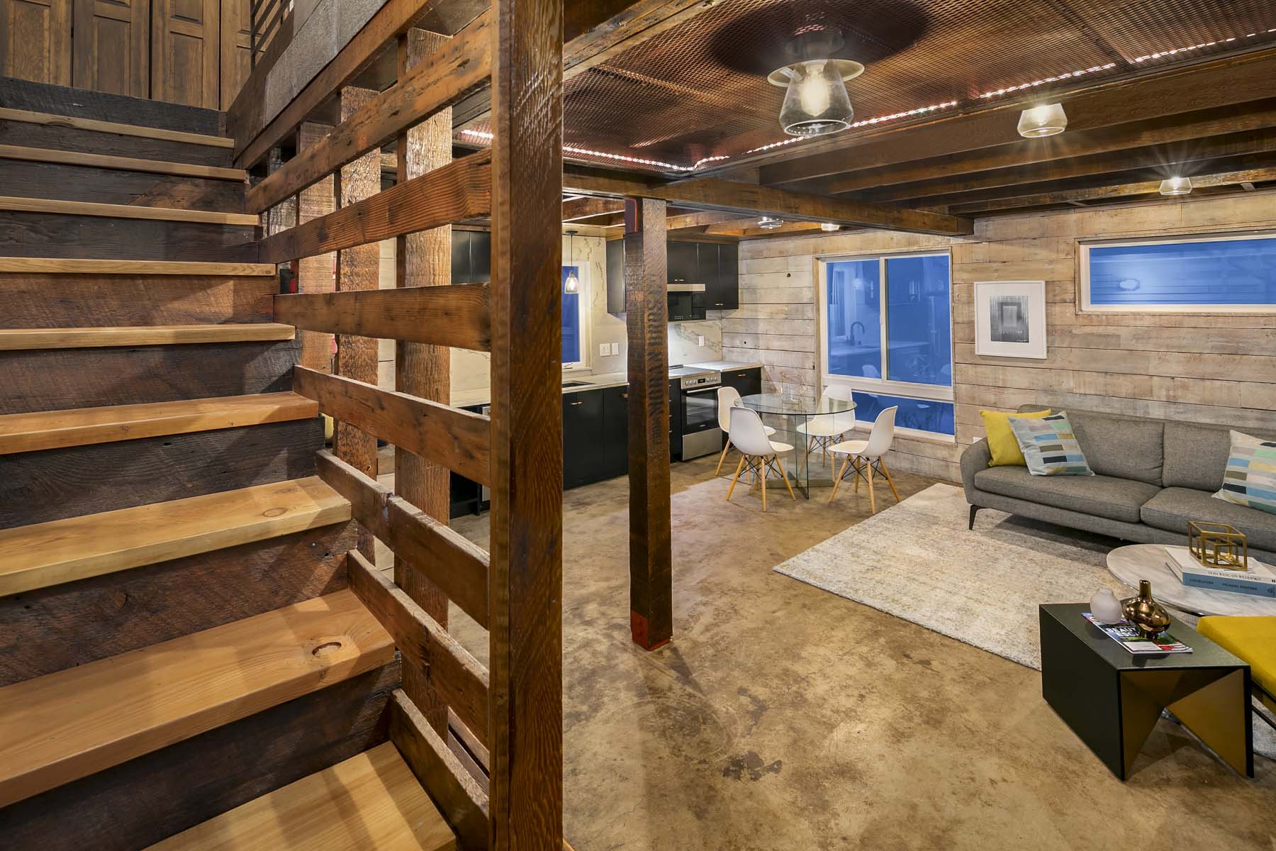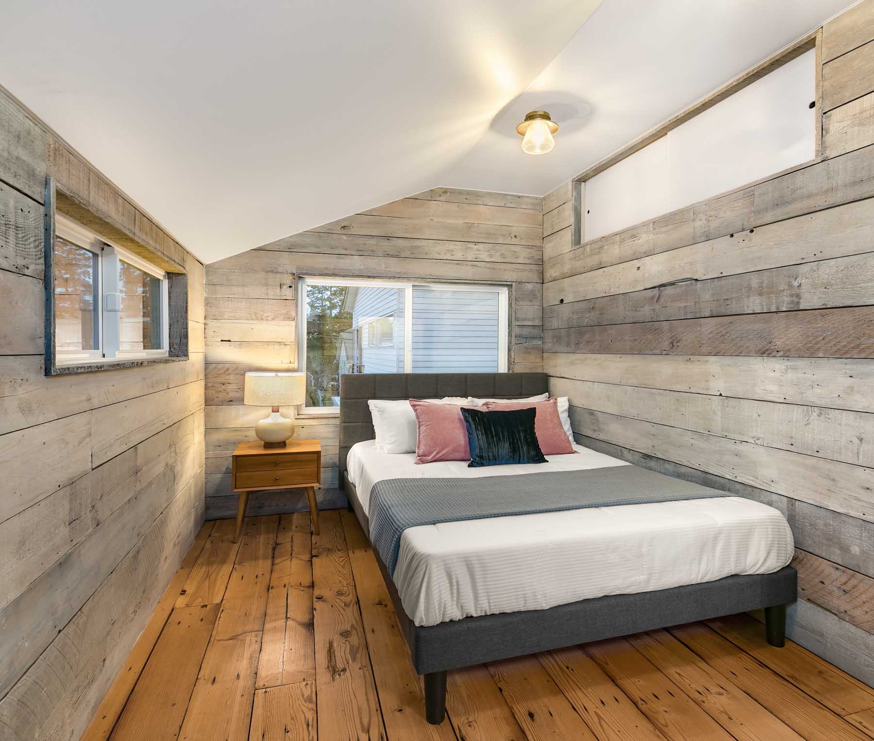 The sleek lines of contemporary design blend with the warmth of reclaimed wood in this modern farmhouse in an ultra-convenient South Seattle location. The main floor is open and bright with hand-stained concrete floors and a slider opening onto a private patio. Stainless-steel appliances and metal cabinets in the kitchen blend beautifully with the rich tones of reclaimed wood walls, posts and beams. Upstairs you’ll find two bedrooms and a full bath. A mini split system provides individualized heating and cooling.